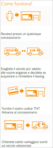Sfruttate le condizioni del Programma TNT ADVANCE per ottenere vantaggiosi sconti sull’acquisto di veicoli commerciali leggeri Fiat ed Iveco. Potete ottenere sconti fino al 25% sul prezzo di listino per tutti i veicoli acquistati o gestiti in leasing. Gli sconti sono validi anche per alcuni accessori. Il Vostro Codice Personale TNT ADVANCE permetterà di accedere agli sconti in modo semplice e rapido.