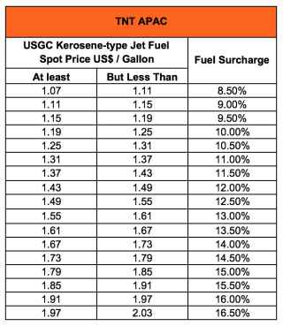 TNT reserves the right to change the fuel surcharge index and table without notice. Both the amount and duration of the surcharge will be determined at TNT's sole discretion. If the Fuel Surcharge rises above the maximum value or drops below minimum value, or there are changes to the trigger points, the above table will be updated.